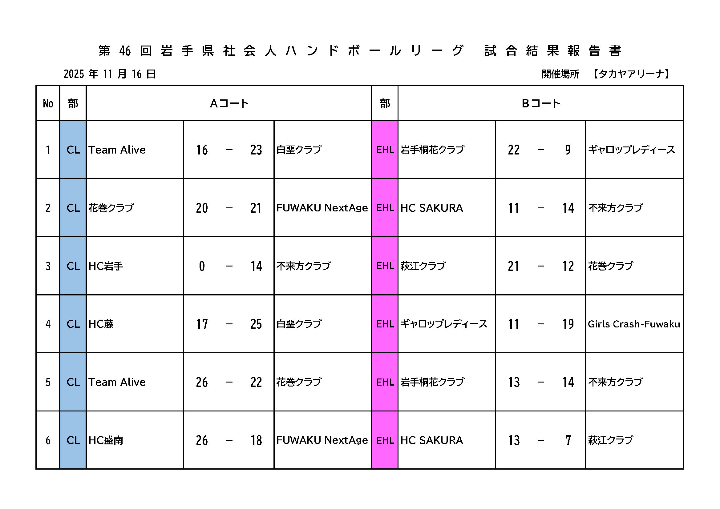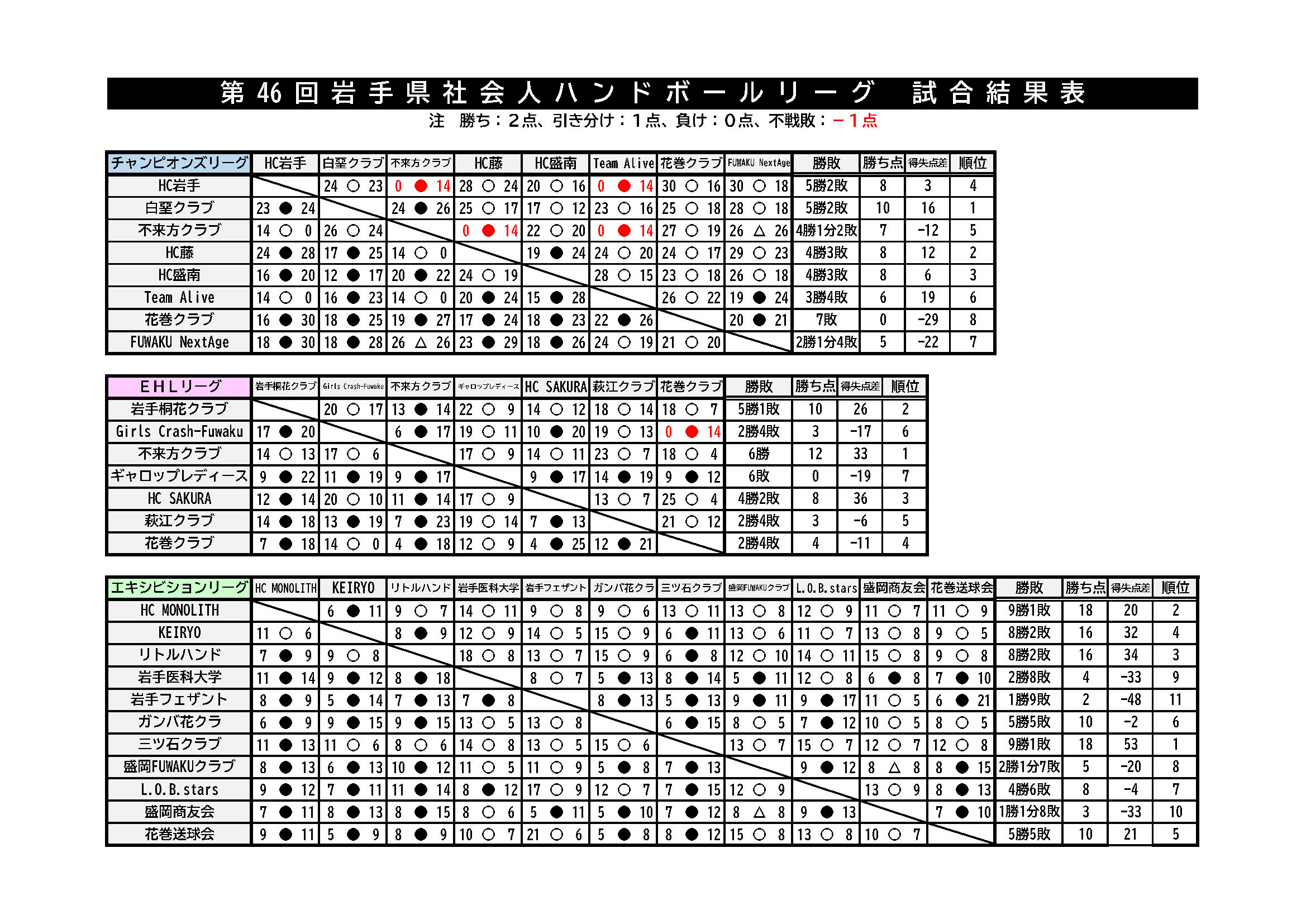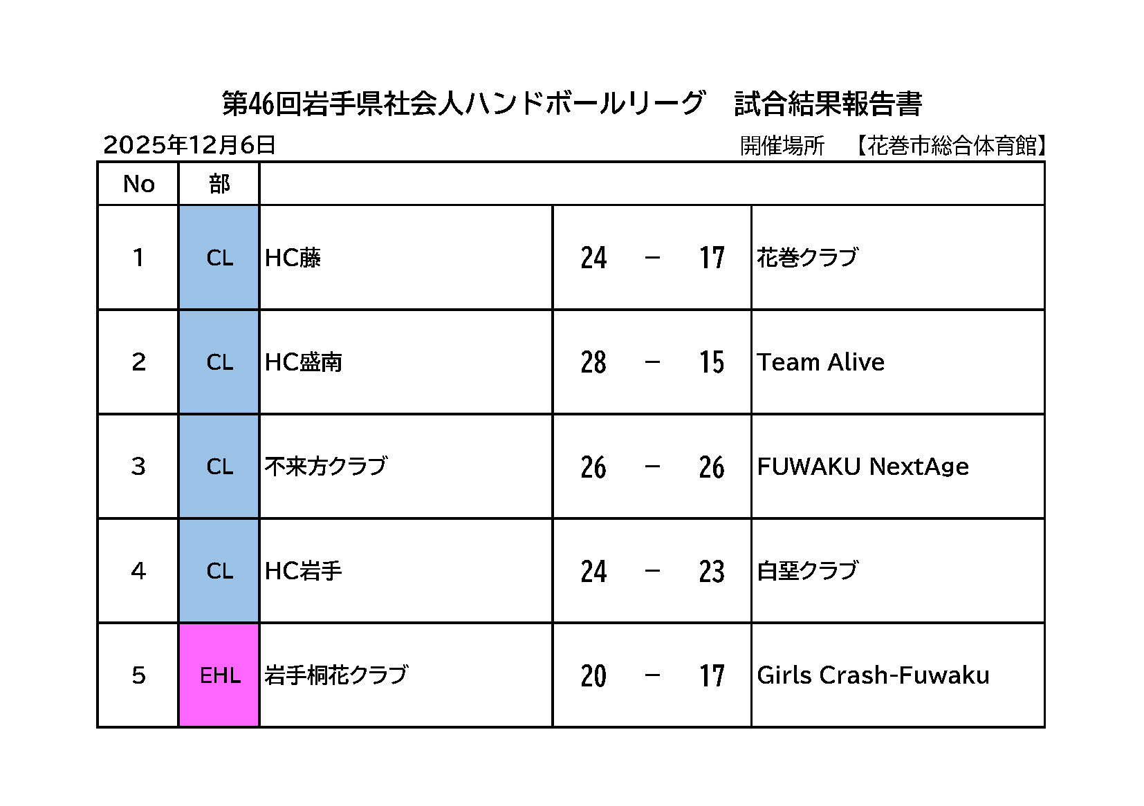 【第46回 岩手県社会人ハンドボールリーグ】 2025年4月10日 最終更新日時 : 2025年12月8日 cohho ▶︎ 試合結果はこちら ▶︎ 組み合わせ 【第46回岩手県社会人ハンドボールリーグ】組み合わせダウンロード ▶︎ 試合結果 第46回岩手県社会人ハンドボールリーグ 星取表 ★ 全試合_星取表ダウンロード ◉ 12月6日(土) ■ 試合結果 12/6ダウンロード ■ 公式記録用紙 12/6ダウンロード ◉ 11月16日(日) ■ 試合結果 11/16ダウンロード ■ 公式記録用紙 11/16ダウンロード ◉ 11月3日(月)祝日 ■ 試合結果 11/3ダウンロード ■ 公式記録用紙 11/3ダウンロード エキシビションリーグ最終試合結果表 ★ エキシビションリーグ星取表ダウンロード ◉ 10月13日(月)祝日 ■ 試合結果10/13ダウンロード ◉ 9月15日(月)祝日 ■ 試合結果 9/15ダウンロード ■ 公式記録用紙 9/15ダウンロード ◉ 8月24日(日) ■ 試合結果 8/24ダウンロード ■ 公式記録用紙 8/24ダウンロード ◉ 7月21日(月)祝日 ■ 試合結果 7/21ダウンロード ■ 公式記録用紙 7/21ダウンロード ◉ 6月7日(土) ■ 試合結果 6/7ダウンロード ■ 公式記録用紙 6/7ダウンロード ▶︎ 開催要項・申込書 【第46回岩手県社会人ハンドボールリーグ】開催要項ダウンロード 【第46回 岩手県社会人ハンドボールリーグ】申込書ダウンロード