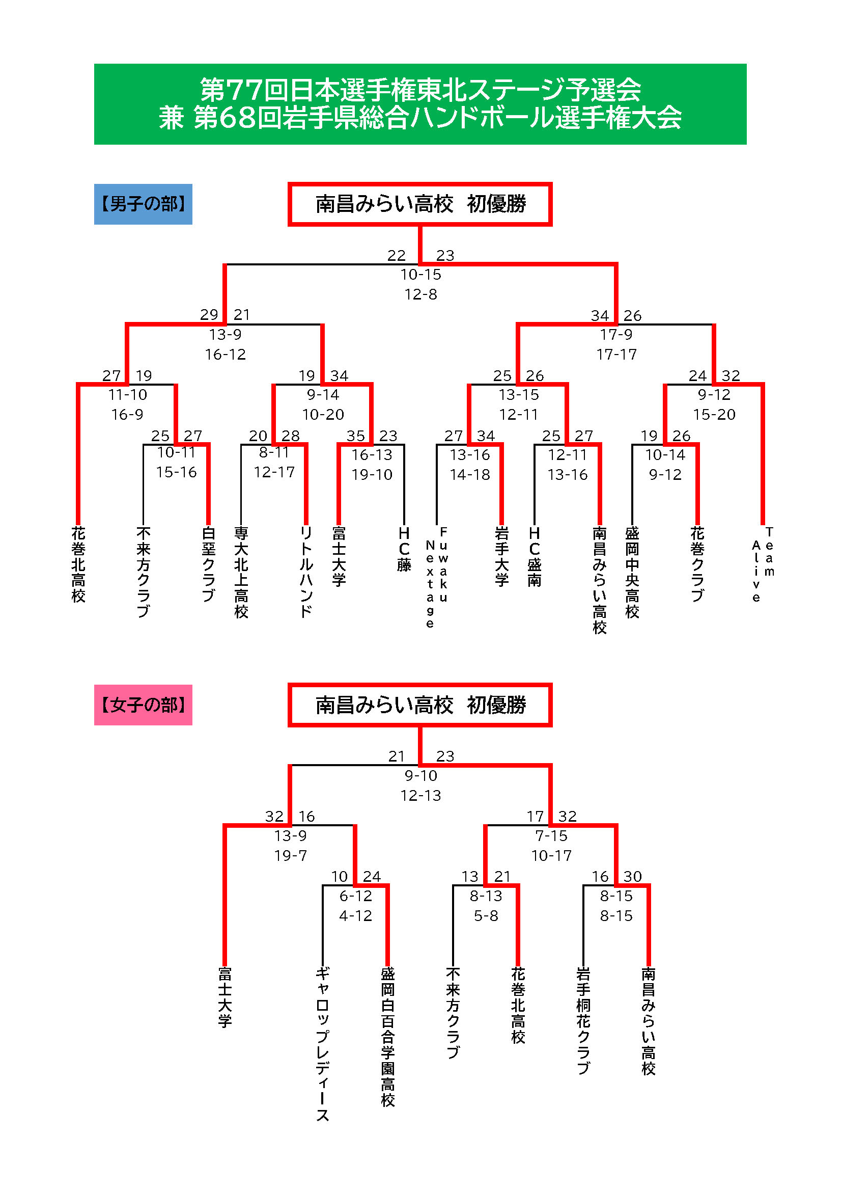 【第77回⽇本選⼿権東北ステージ予選会 兼 第68回岩⼿県総合ハンドボール選⼿権⼤会】 2025年7月12日 最終更新日時 : 2025年9月2日 cohho ▶︎ 組み合わせはこちら ▶︎ 試合結果 ● 試合結果(PDFデータ)ダウンロード ▶︎ 組み合わせ・タイムテーブル ● 組み合わせ・タイムテーブルダウンロード ▶︎ 関係チーム各位への通知・要項・参加申込書 ◉ 関係チーム各位への通知ダウンロード ◉ 要項ダウンロード ◉ 参加申込書ダウンロード
