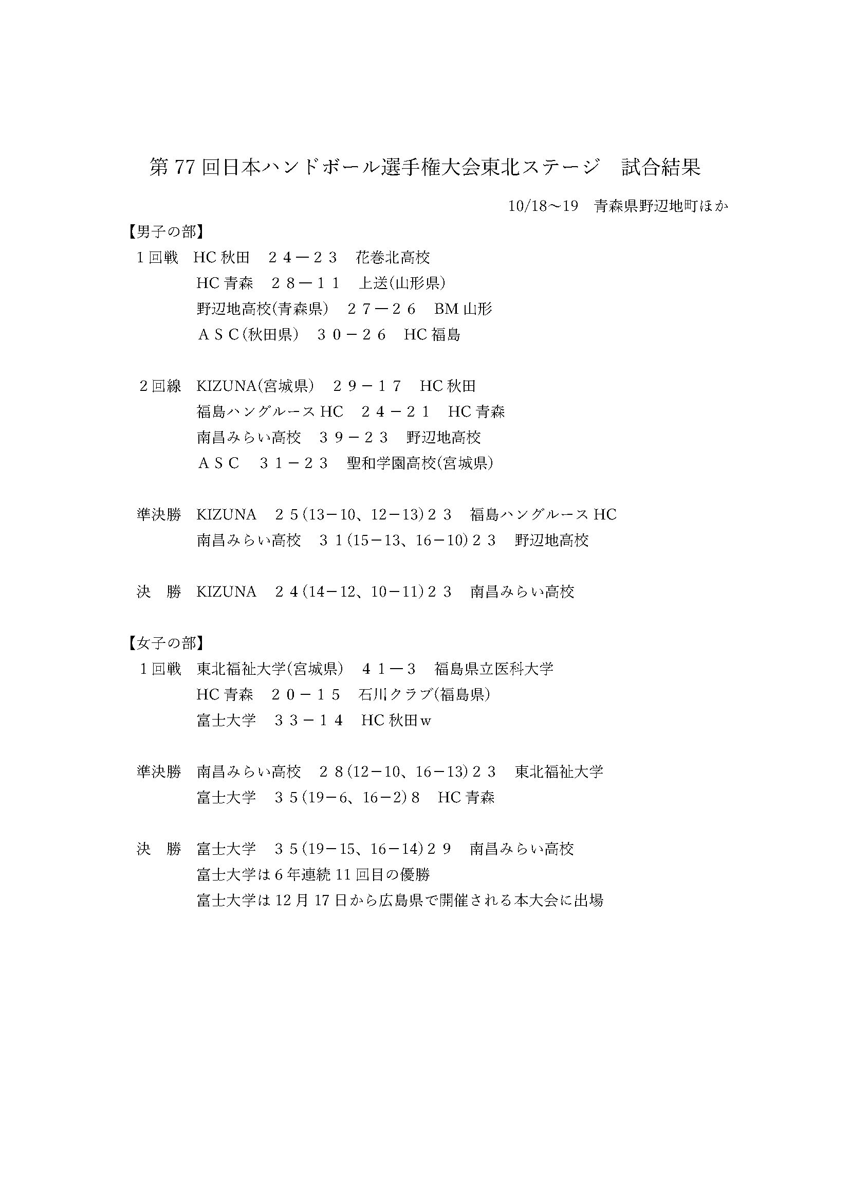 【第77回日本ハンドボール選手権大会東北ステージ】試合結果ダウンロード