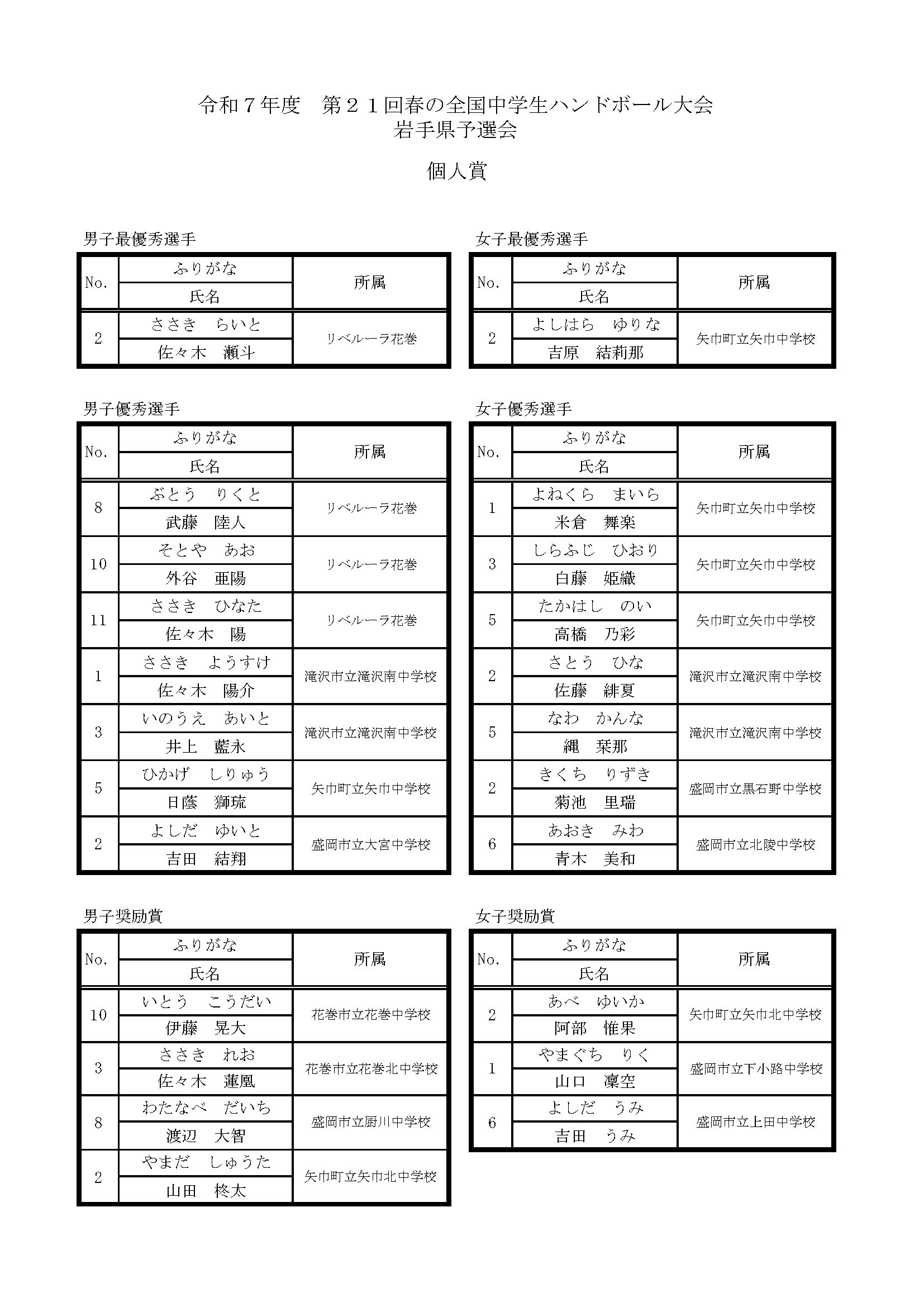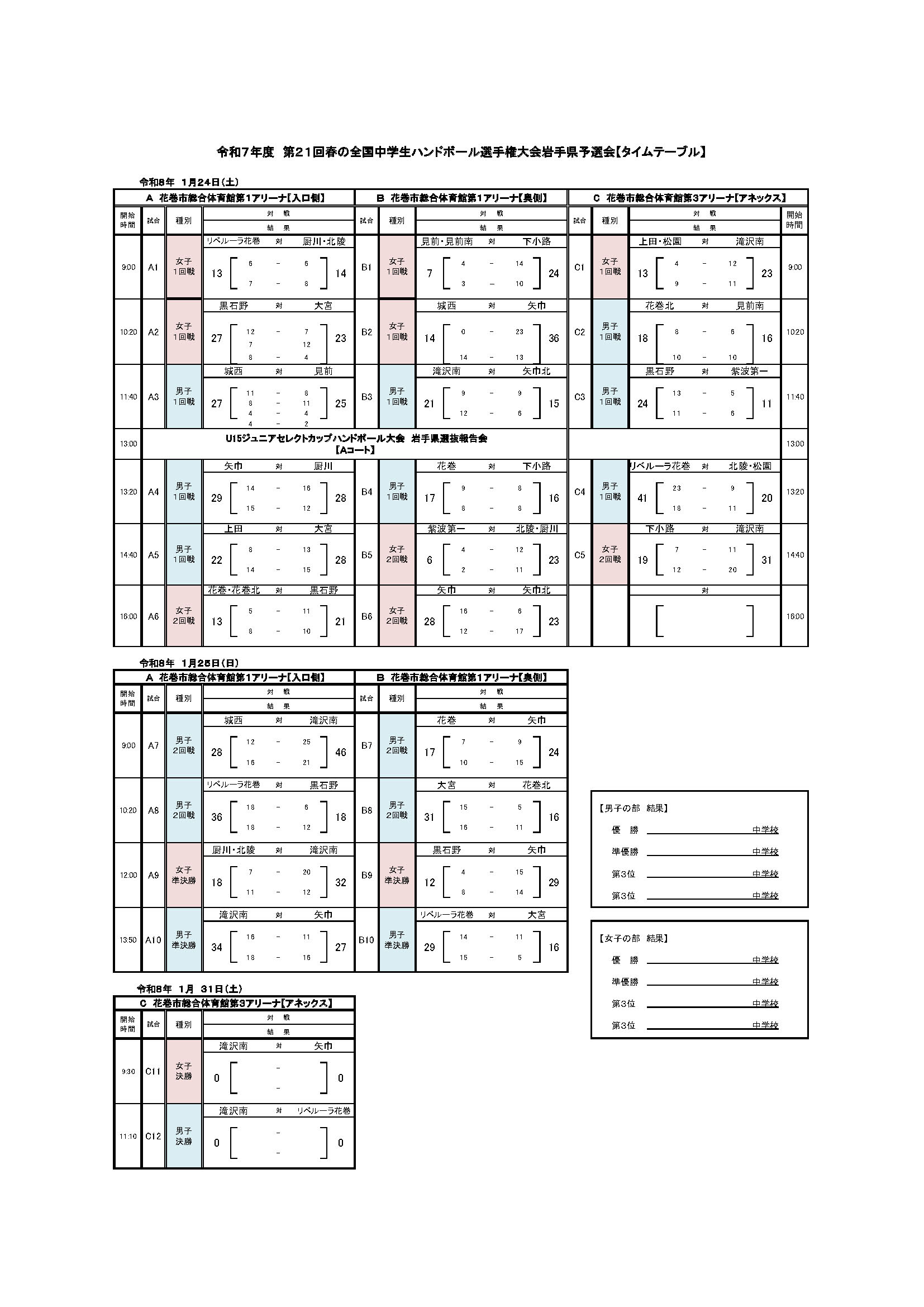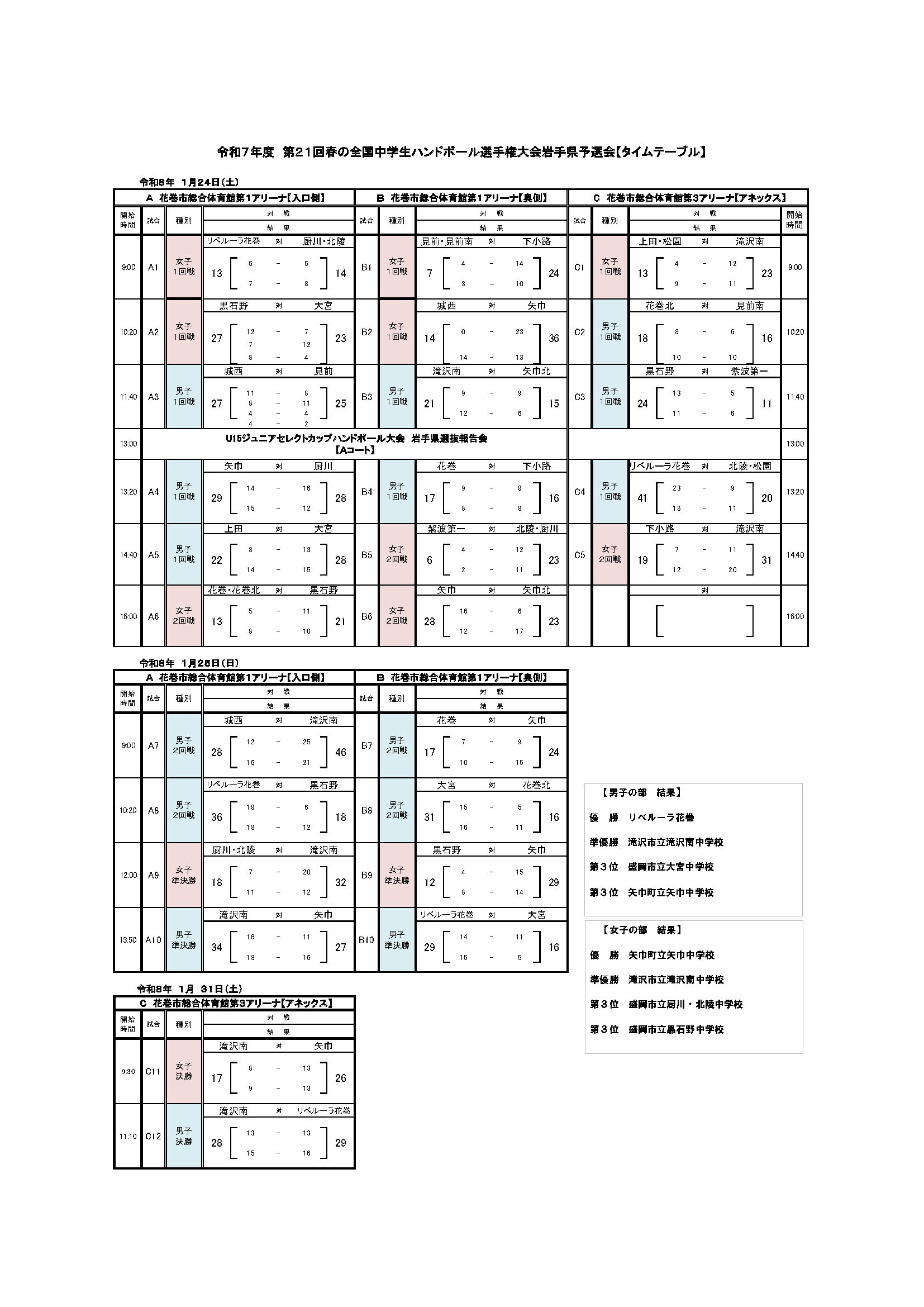 【第21回 春の全国中学生ハンドボール選手権大会 岩手県予選会】 2026年1月11日 最終更新日時 : 2026年2月1日 cohho ▶︎ 試合結果 【第21回春の全国中学生ハンドボール選手権大会岩手県予選会】最終結果ダウンロード 【第21回春の全国中学生ハンドボール選手権大会岩手県予選会】個人賞ダウンロード 【第21回春の全国中学生ハンドボール選手権大会岩手県予選会】試合結果(24・25日)ダウンロード ▶︎ 組み合わせ 【第21回春の全国中学生ハンドボール選手権大会岩手県予選会】組み合わせダウンロード