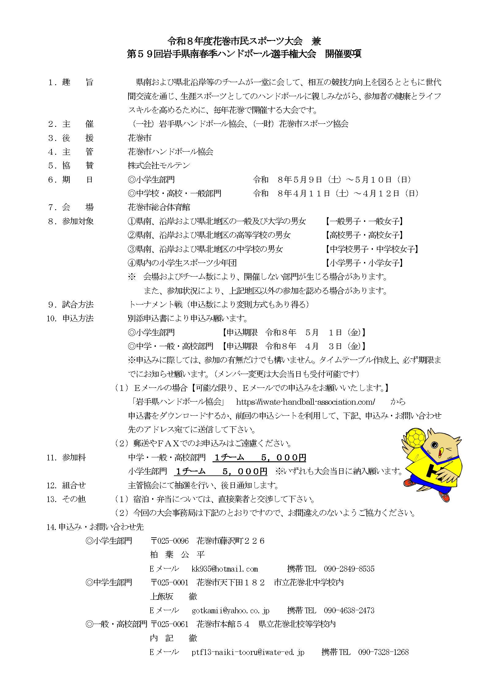 3. 【令和8年度花巻市民スポーツ大会 兼 第59回岩手県南春季ハンドボール選手権大会】開催要項